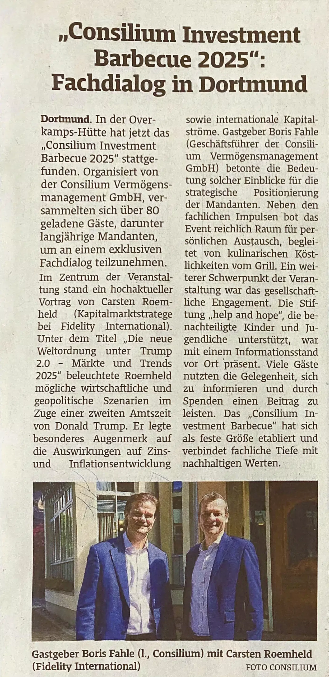 Consilium Investment Barbecue 2025: Fachdialog in exklusiver Atmosphäre „Die neue Weltordnung unter Trump 2.0“ Dortmund, den 30. Mai 2025. Bereits zum wiederholten Mal setzte das Consilium Investment Barbecue ein starkes Zeichen für exklusive Finanzexpertise,...